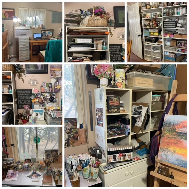But as a mixed media artist there is SO MUCH to organize! Acrylic paint, oil paint, cold wax, matte medium, glossy medium, alcohol inks, solvents, pencils, graphite, charcoal, stubbies, brushes, markers, watercolors, pastels, oil pastels, papers, collage papers, paper cutter, napkins, canvas, cradled wood, wood slabs, tiles, fixatives, do-dads, embellishments, old jewelry pieces, ribbons, silk flowers, dried flowers, glues, glue guns, adhesives, mats, frames, a little of this, a little of that, Silhouette Cameo cutting machine, vinyl, HTV, cutting boards, rulers, scissors, fabric, sewing machines, thread, art journals, spiritual journals, handmade journals, HOLY MOLY! It’s a veritable treasure cache of creative material…oozing and overflowing every inch of my space. Not to mention easels, drawing tables, work tables, display panels, hardware, computer desk, super duper bright lights and overhead lighting. Along with all the magical machines, cameras, laptops and ipads…